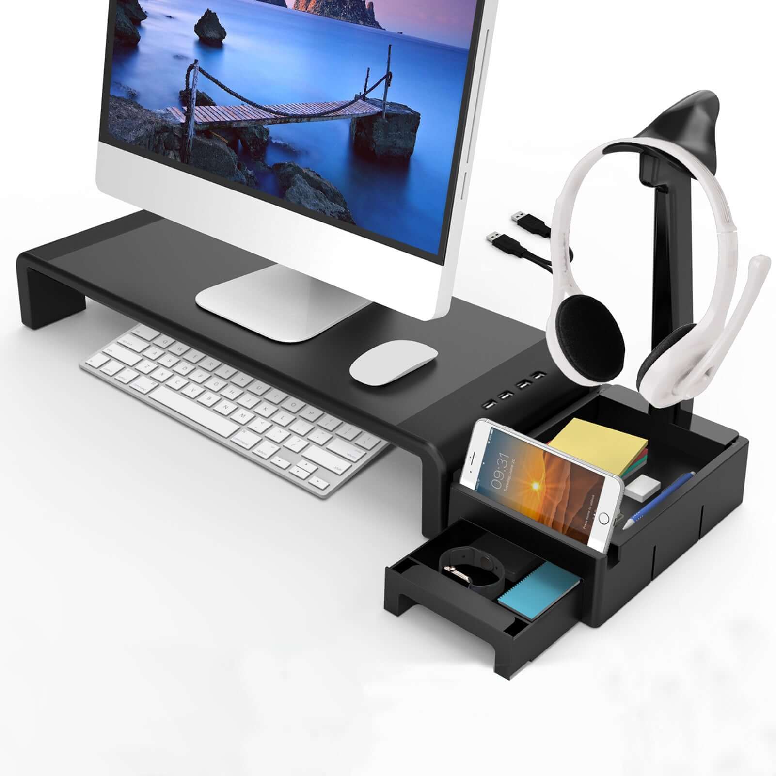 Optimise ton espace de travail avec ce support réhausseur multifonction, conçu pour améliorer ta posture, libérer de l’espace et styliser ton bureau. Grâce à sa longueur ajustable, il s’adapte à tous les écrans et ordinateurs portables, tout en offrant une base stable et élégante.