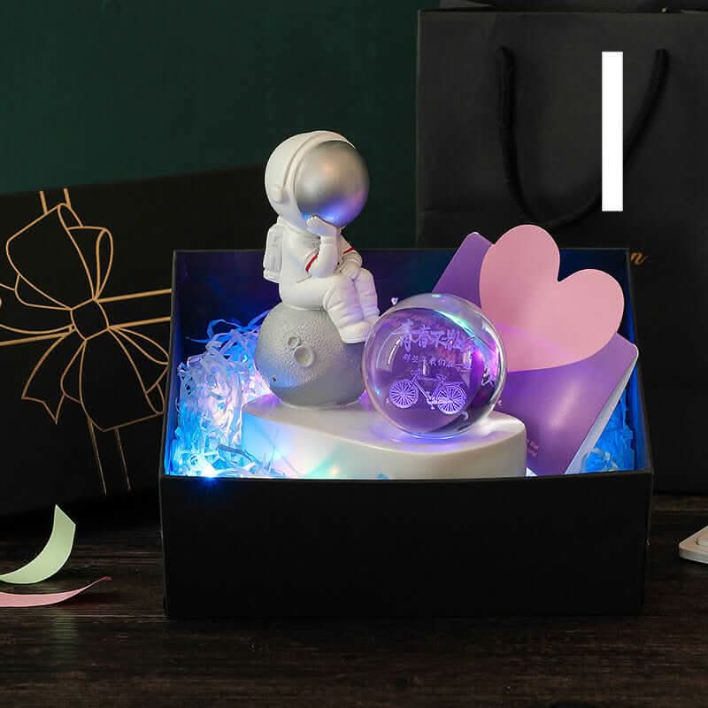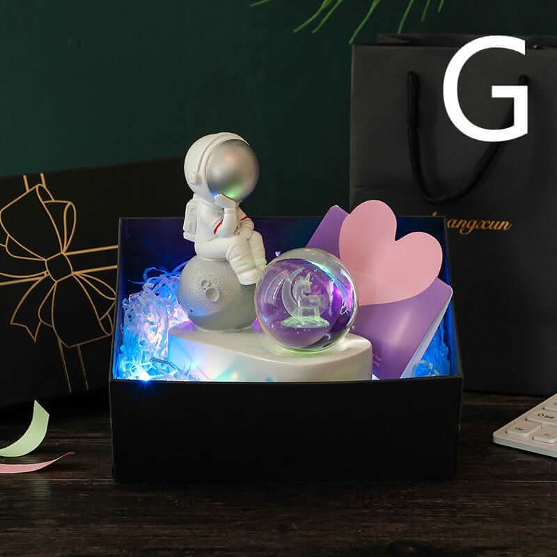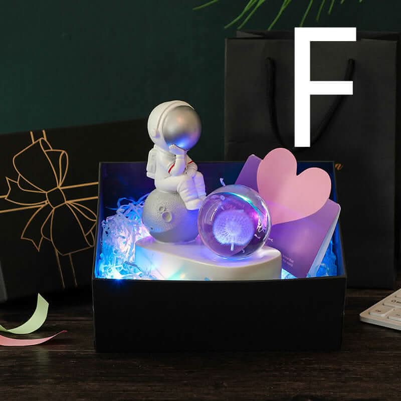 3. Admire la lumiĂšre dĂ©gradĂ©e qui illumine la boule de cristal et met en valeur l’astronaute.