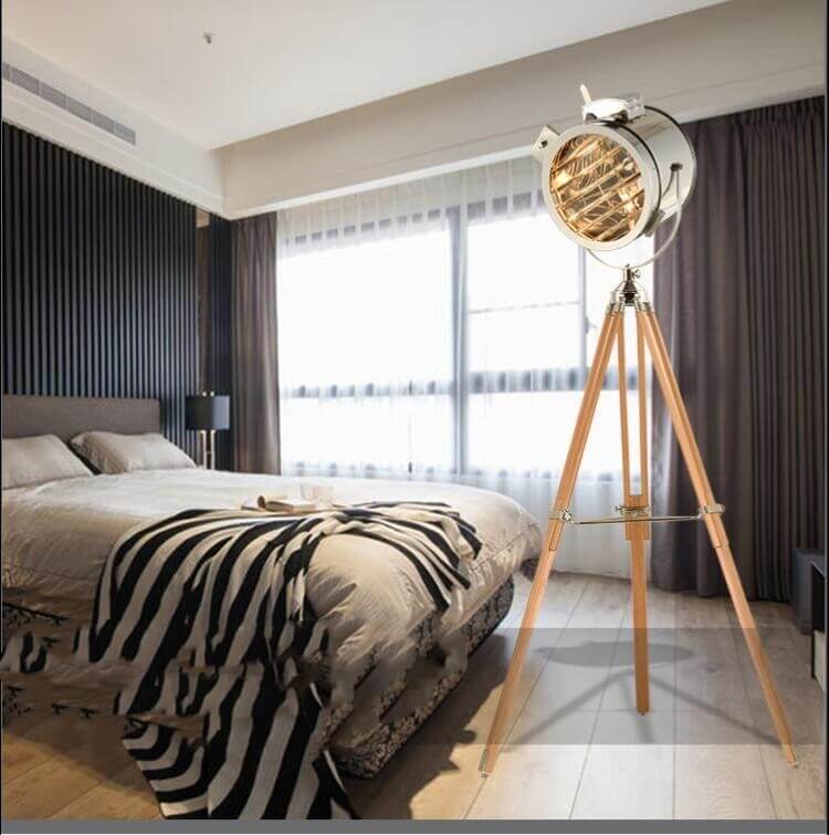 • Style industriel chic : Trépied métallique et abat-jour en bois pour une esthétique brute et élégante